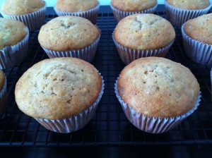 Then I placed my batter into my muffin tins and baked them for about 20 minutes making sure to rotate half way through. A toothpick inserted into the center should come out clean. After the short trip through the oven, I let them cool on a cooling rack.