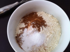 In a large bowl I whisked together 3 cups of flour, 1 1/2 teaspoons of cinnamon, 1 teaspoon of baking soda, and 1 teaspoon of salt. I set that aside.
